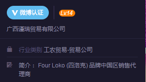 上述名为“FOUR LOKO旗舰店”的卖家,其营业执照信息显示为“广西谨瑞贸易有限公司”。而微博“FOUR-LOKO-中国”官方账号认证信息也正是这家贸易公司。记者注意到,其微博简介为“FOUR LOKO (四洛克) 品牌中国区销售代理商”。