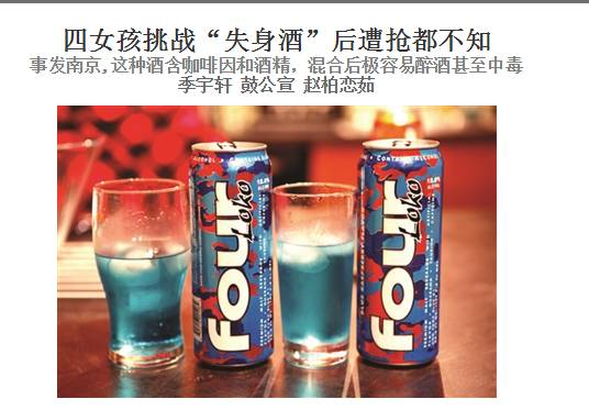 24日,扬子晚报报道了一篇《四女孩挑战“失身酒”后遭抢都不知》其中提到的“失身酒”就是国内被热炒的那款果类酒,名为FOUR LOKO。