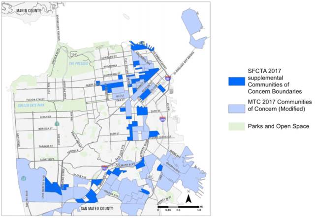 旧金山交通管理局最新公布的游行区域地图,将一些社区定义为“重点关注社区”(划分标准为:低收入、英语水平有限、家庭拥有汽车数量为0等)。