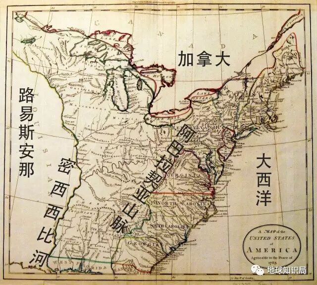 1785年美國地圖。。剛獨立兩年,美國人已經把整個密西西比河以東都劃爲自己的地盤了。購買以西的路易斯安那是1803年