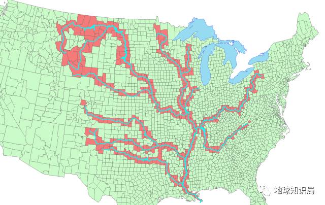美國中部不光是大平原,更是被河流網絡滋養連接起來的大平原,如同中國長江流域的每個省份都以一條長江支流爲基礎一樣,美國中部則在更大的範圍內整合在一起,各州的名字也往往與支流相同。這一龐大的網絡覆蓋了美國三分之一的國土面積(不算阿拉斯加則比例更大),比新疆西藏加起來還要龐大。