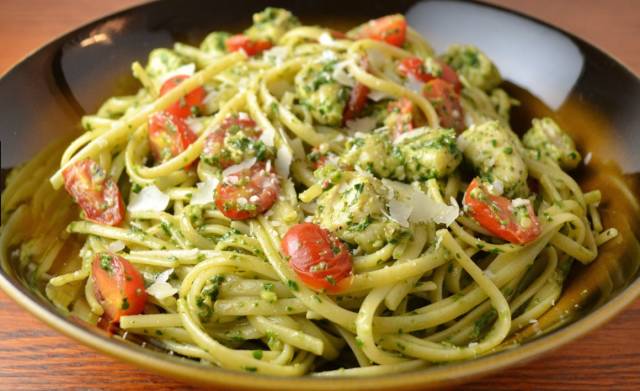 做法:意面煮熟放着备用,鲜罗勒(或罗勒酱)和松子磨碎,加橄榄油等调酱,培根蒜末炒香,把备好的意面、罗勒酱翻炒,加入黑胡椒,一道清新爽口的意面就做好啦。