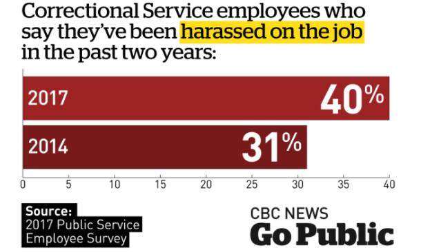 在2017年对公共服务雇员进行的年度调查中,40%的狱警表示,他们在过去两年里一直是性骚扰的受害者,三年前这一比例为31%。在40%的人受到骚扰的情况下,60%的人表示是同事的骚扰。CSC表示,现在所有的员工正在接受反骚扰培训。