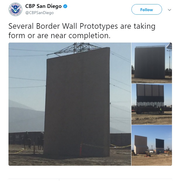 美国当地时间10月11日,美国海关边境保护局圣迭戈分局在推特上贴出了四张边境墙体原型的照片,称这些原型墙均已“成型或接近完工”。