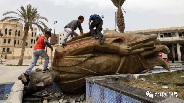 孩子们在被推倒的阿萨德雕像上玩耍