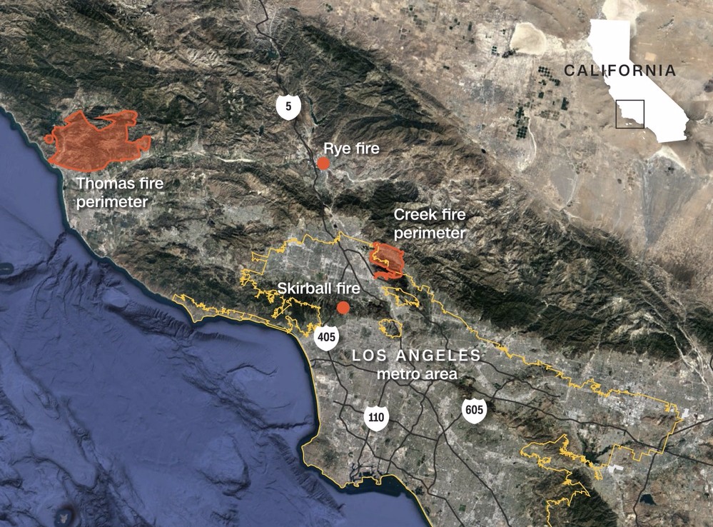 在此之前,南加已经爆发了多场火灾。其中影响文图拉县的托马斯野火已经影响了超过6.5万英亩的土地并影响101号公路。