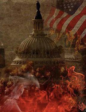 这幅恐怖海报是华盛顿国会大楼陷入火海,一名恐怖分子肩扛AK-47步枪,身上绑着炸弹和弹药,似乎预示着,他们要采取而自爆式袭击来炸掉美国国会。