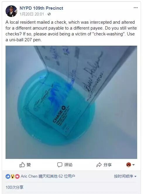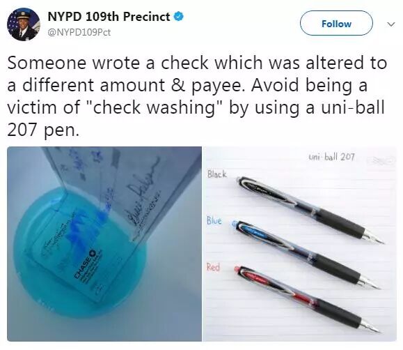在1月20日,纽约警局109分局局长哈里森(Judith Harrison)在社交媒体上提醒民众谨防此类罪案,建议用字迹很难涂改的uni-ball 207型号墨水笔开支票。