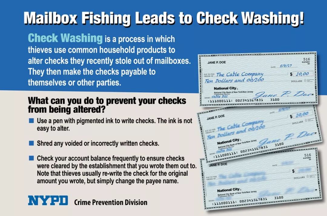 你还在寄支票付账单吗?那务必小心!在美国华人社区里连连出现"篡改支票"(Check Washing)案,犯罪分子通过“邮箱钓鱼”Mailbox Fishing,偷走邮寄的支票,然后用化学药剂涂掉原来的自己,篡改金额和支付对象。据报道,"篡改支票"(Check Washing)案已经不是第一次发生在美国的华人社区,在纽约、洛杉矶、旧金等传统华人城市都有过类似案件发生。