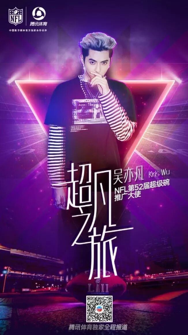 美式足球联盟(NFL)宣布任命中国知名当红艺人吴亦凡(Kris Wu),担任NFL第52届超级碗中国推广大使;他将成为首位在超级杯LIVE舞台上表演的华人。此举显示NFL看好中国市场发展前景,准备进一步扩大NFL在华人世界的影响力。