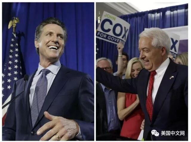 当天开票不久几乎就已确定结果,两位热门人选,现任民主副州长纽森(Gavin Newsom)和受川普背书的共和党商人考克斯(John Cox)一路领先,进入11月决选。