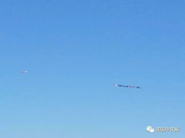 州长选举中,不少华裔都转向共和党参选人安伦(Travis Allen),并自发为其捐款,在5月底打出醒目飞行广告。