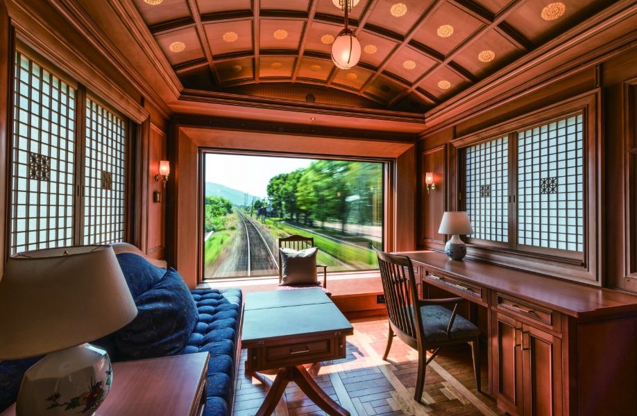 七星号是日本最奢华的火车,一共拥有7节车厢14个套房。红棕色的木质装潢、古典绘花陶瓷、还有窗外那潺潺小溪和大片农田,让人仿佛一瞬间置身于古代日本。