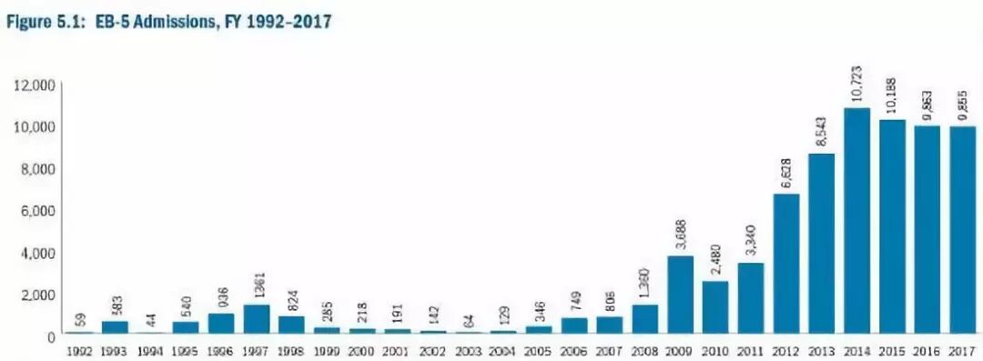 EB-5项目的申请人数在2014年达到最高峰后,逐渐开始缓慢回落。(移民局监察办公室2018年年度报告图)