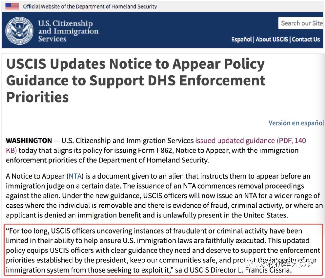 这份通知的收件人一定是非美国籍,它会给出一个明确的时间让当事人到庭,这份通知正是开始遣返程序的第一步。