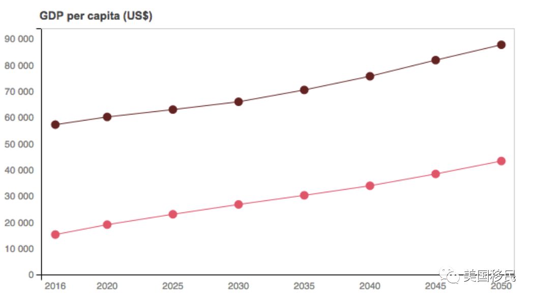 (中美人均GDP差距。资料来源:PWC官网,深色为中国,粉色为美国。)