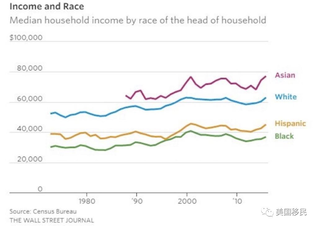 据纽约时报报道,美国华裔家庭收入中位数约$7.0万,远高于美国白人家庭收入中位数$5.96万。