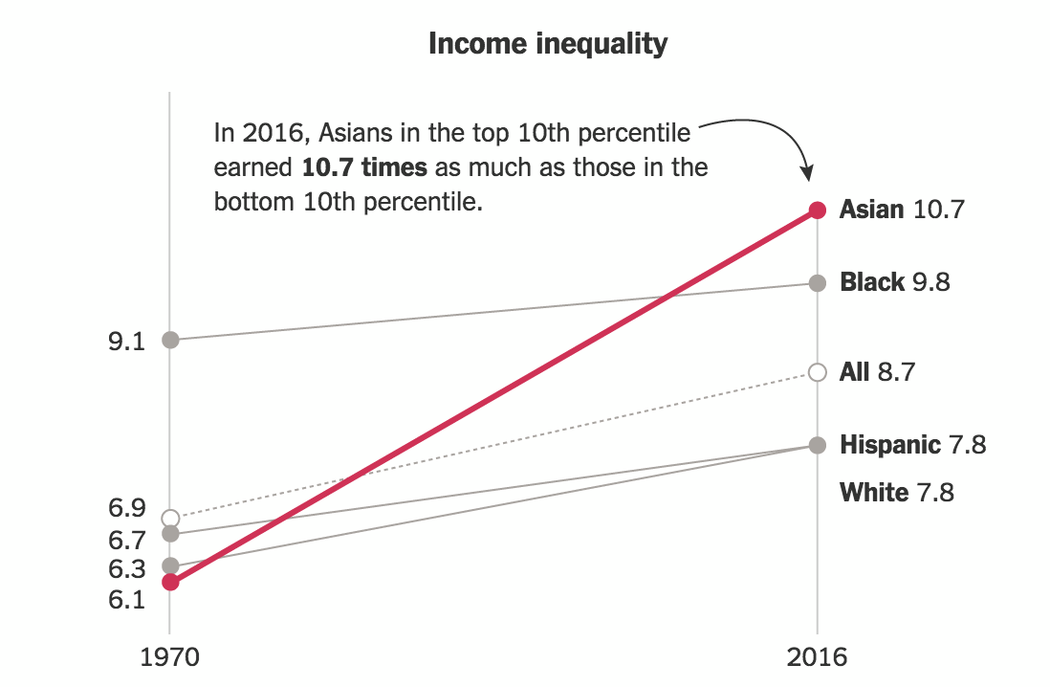 從1970年到2016年的這段時間裡,隨著高收入者的收入增長加快,美國確實有了更多的非常富有的亞裔。雖然大多數亞裔美國人的生活水平比其他少數族裔群體的高,而且白人和亞裔的收入在每個收入層次都超過非洲裔和拉美裔,但是,亞裔美國人中的貧困人口也在增長。