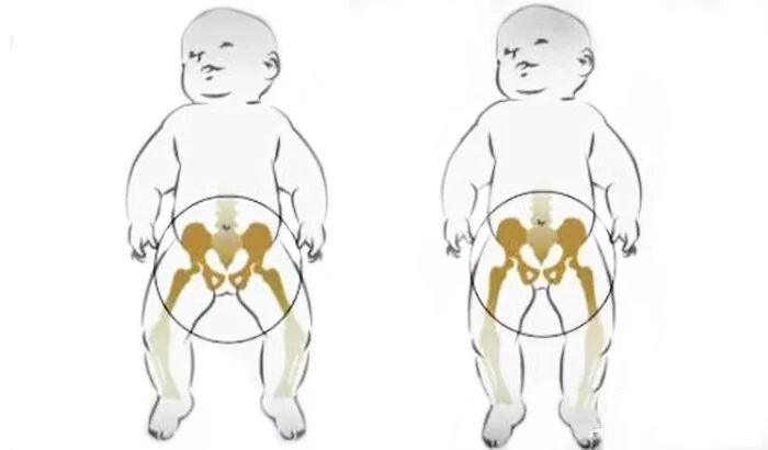 图右:被强行拉伸后,宝宝的腿伸直并拢,不利于髋关节发育。
