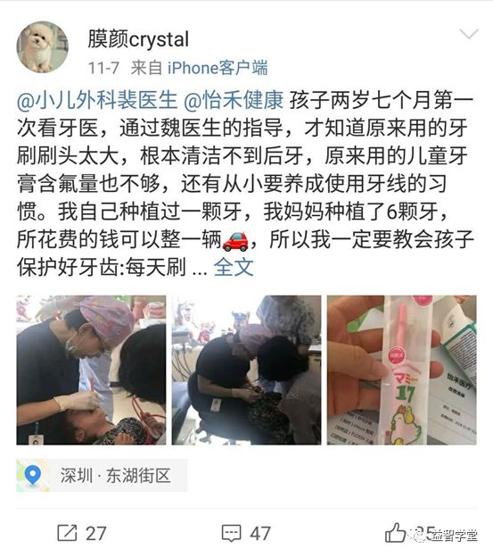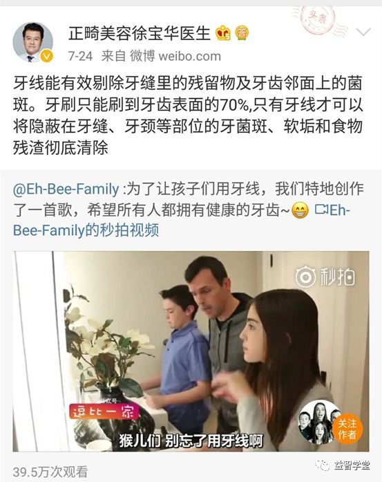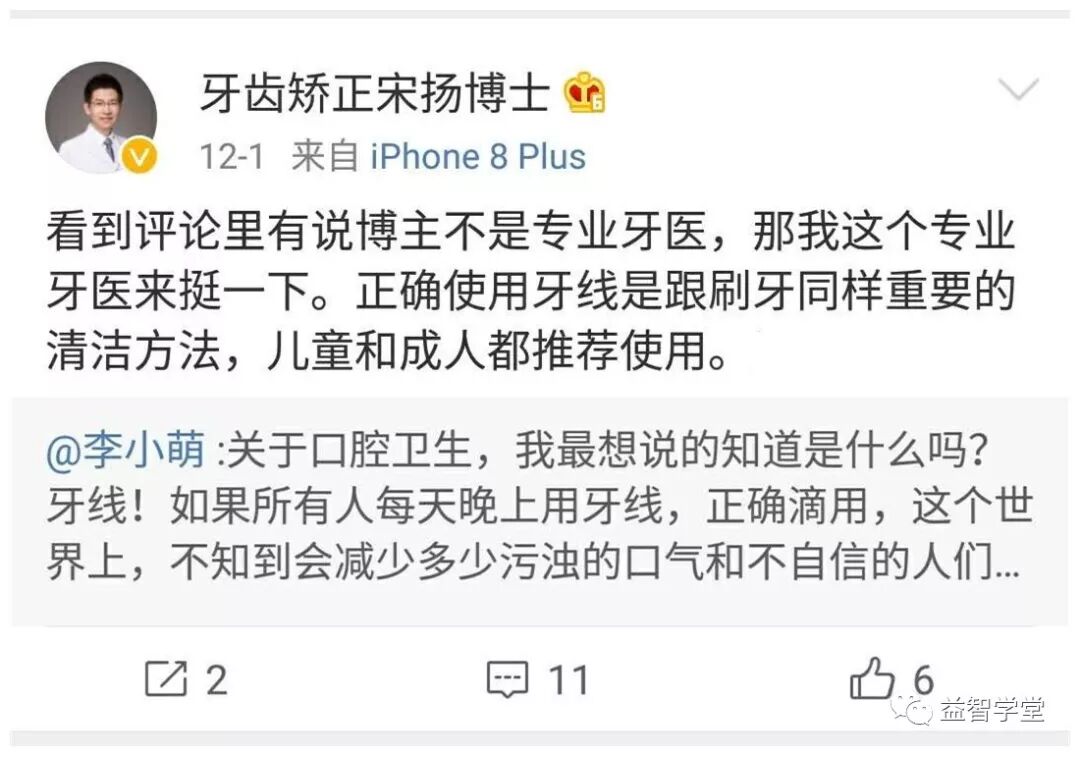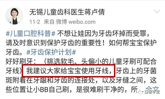 在微博上,很多牙医和专家也强烈建议,儿童只要出现牙齿密集萌出后,大概在1岁-2岁之间,就应该开始使用牙线或者牙线棒。