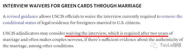 对于结婚未满2年,已拿到临时绿卡的人,想要申请永久绿卡,在申请永久绿卡时,移民局为了缓解当地面谈的等候时间,根据新政,移民局现在有权免掉部分申请人与美国公民结婚的外国人永久绿卡前的面试,只要他们能够保证婚姻的真实有效性,并满足其他一些条件。