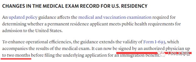 最新的政策指导将影响绿卡申请人是否符合入境美国的公共卫生要求所需的医疗和疫苗接种检查。移民局把I-693有效期从原来的12个月延长到了18个月,不过虽然I-693的有效期延长到了18个月,体检必须在提交申请的前两个月完成,不能太早做体检。需注意的是:体检医生必须是移民局认可的医生(可在移民局官网https://my.uscis.gov/findadoctor上查到)