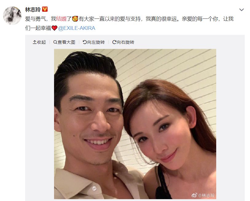 在林志玲发出微博的前3分钟,作为另一半的日本男子组合EXILE成员AKIRA,用中文发出了一篇深情款款的微博,发出爱的宣言。