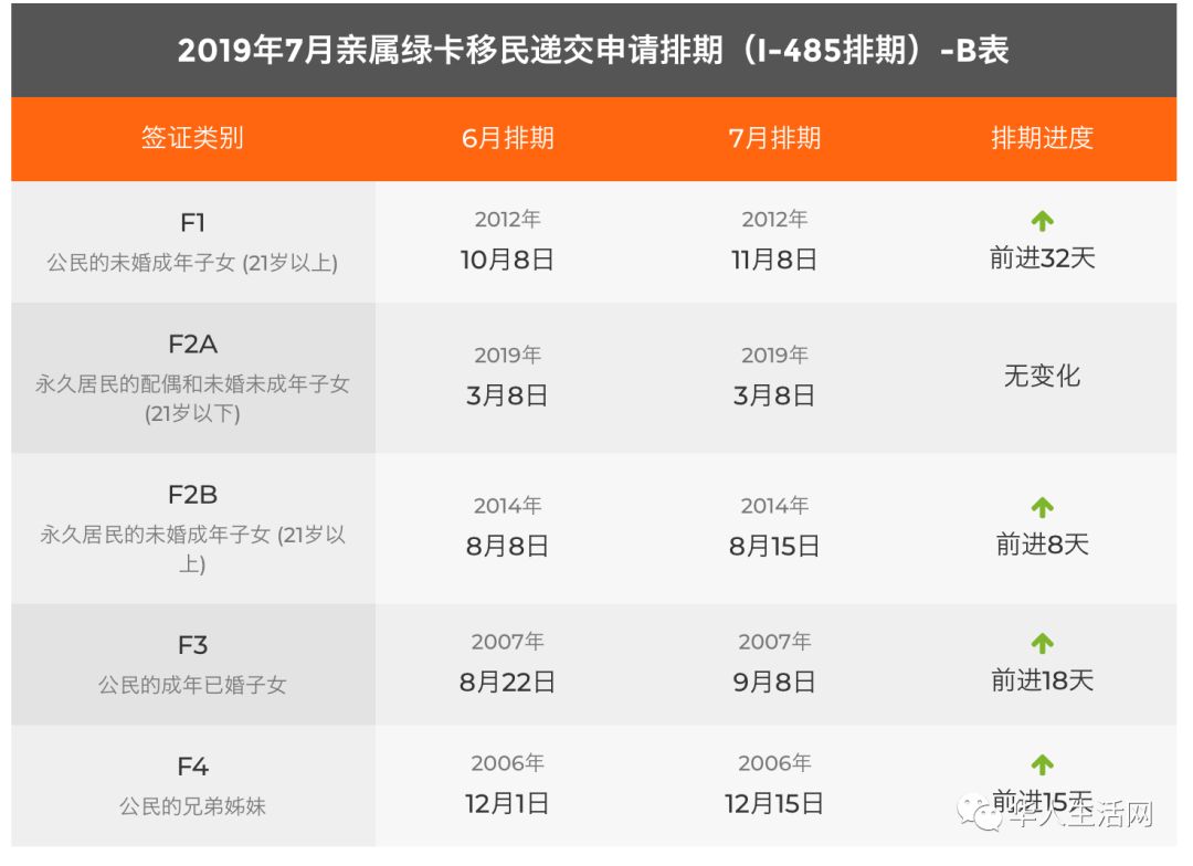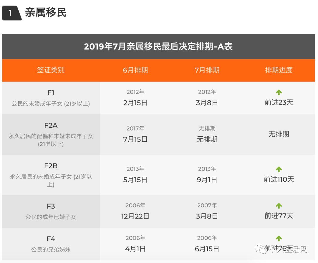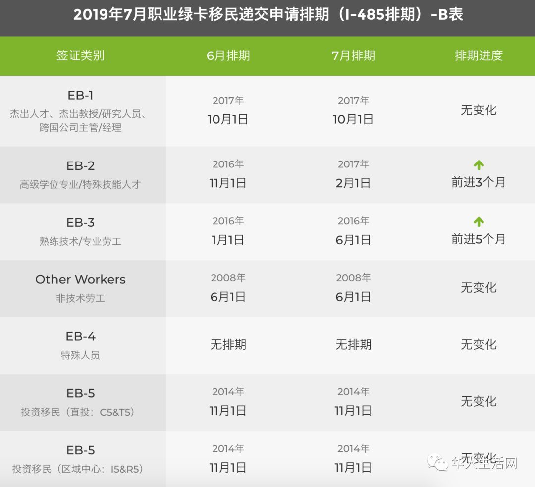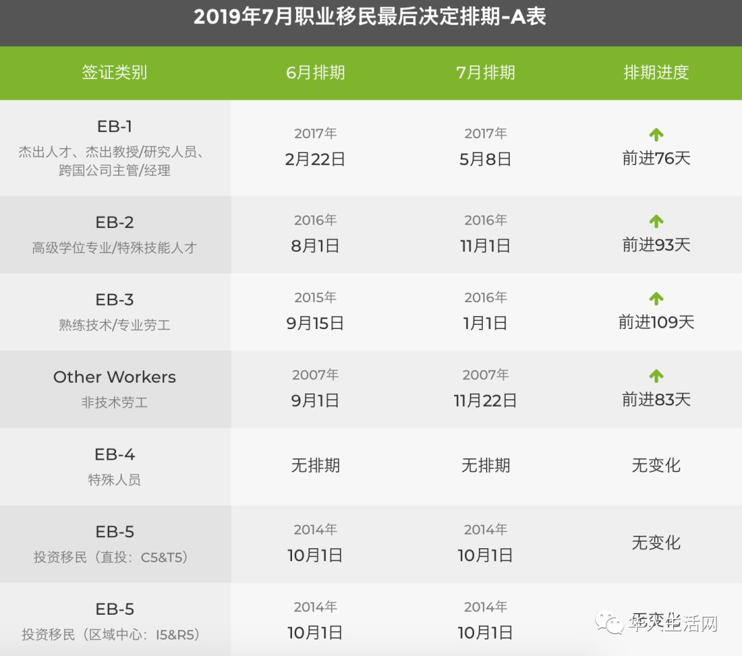 国务院公布的2019年7月绿卡移民排期公布,亲属移民前进幅度较大,职业移民 EB2 前进幅度较大有一个半月,EB3 稳步前进。