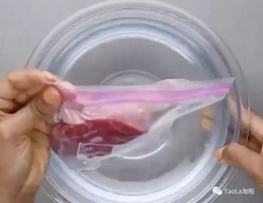 3.将半密封的保鲜袋放入盆中,注意水要没过袋子里的肉,但不要没过保鲜袋口。