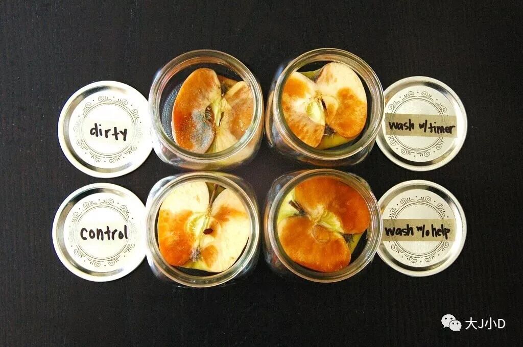 像下面这样的,是使用苹果做的实验,把苹果一切二,放进装有水的密闭容器。