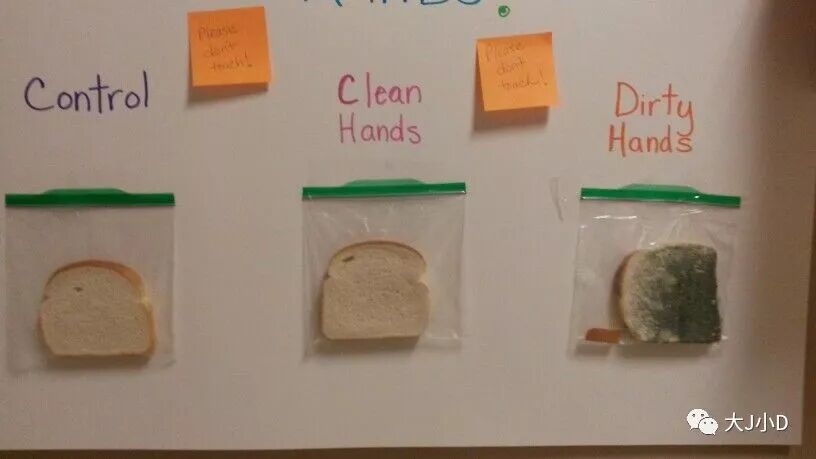 这个实验非常著名,基本上美国这边大部分的幼儿园谈到个人卫生都会做,而且也很容易,也很推荐大家在家试试看。