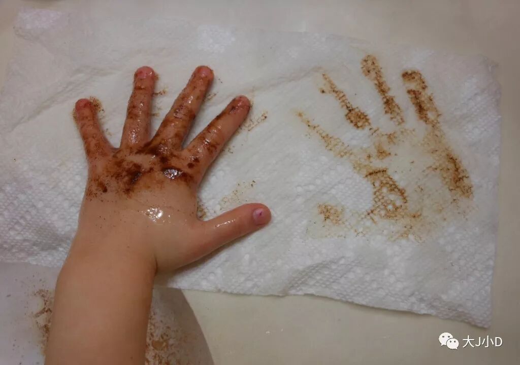和上面这个有一点点相似,在孩子的手上涂一点食用油,然后再撒一点肉桂粉。