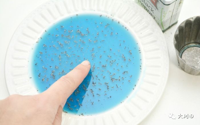 先在清水中撒一点胡椒粉,如果希望孩子更容易看到胡椒粉,可以在清水里滴一些颜料,但并不是必需。