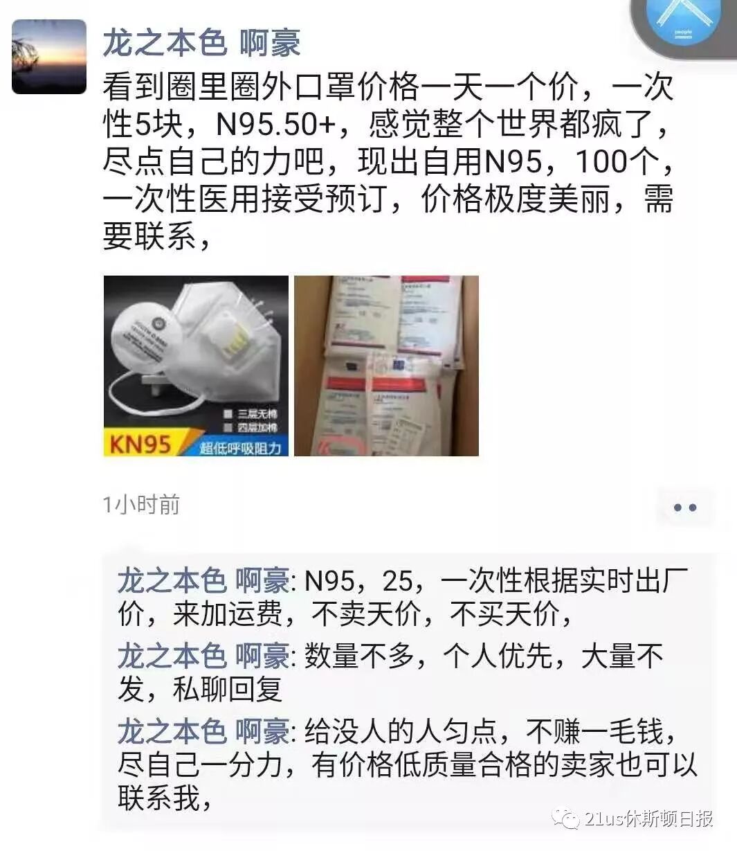最近微信上就出现了很多打着销售库存口罩,干着骗钱勾当的黑心微商。他们在朋友圈、微信群里疯狂发布口罩广告,自称有N95、医用外科口罩销售,价格美丽,一毛钱不赚。