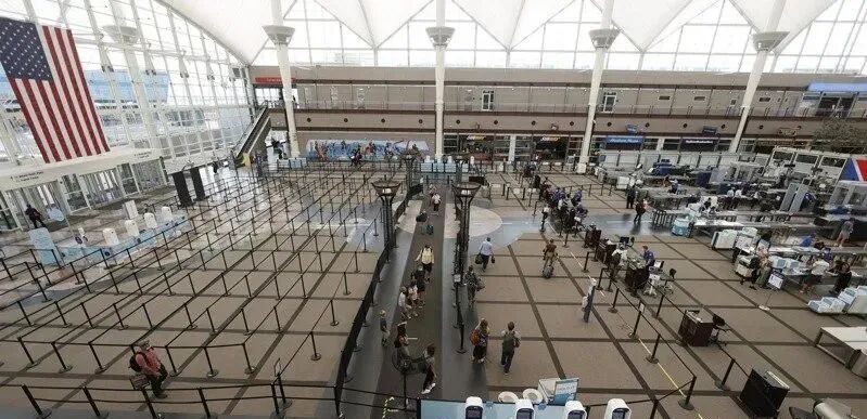 CDC宣布放宽境外进美国的14天隔离限制。图为7月时空无人一人的科罗拉多州丹佛国际机场航站大厦。(美联社)