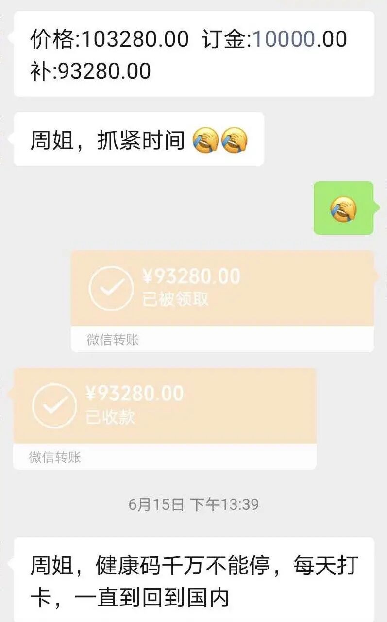周女士的儿子在加拿大读本科,疫情爆发后,她担心儿子安全,一直在找渠道购买机票,让儿子回来。6月,她通过朋友推荐联系上了一位特价机票代理人,原价4万多的东方航空经济舱机票,最终以1万订金,10万多元的成交价格,在代理人手里买到了7月从温哥华直飞成都的机票。