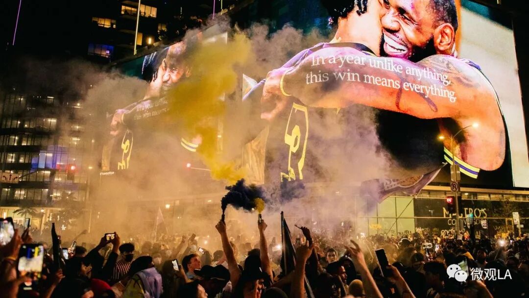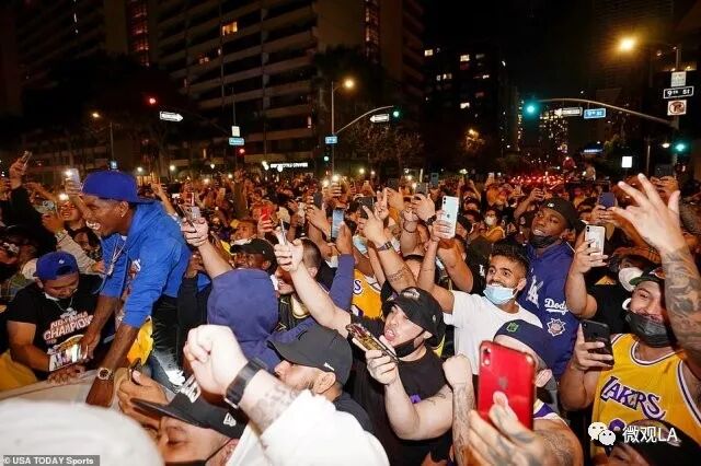 湖人队夺得NBA冠军后,在洛杉矶市区举行的喧闹庆典中,球迷们蜂拥而至。