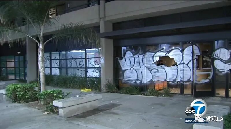 9号大街和花卉街的交叉路口的商店,包括星巴克专卖店,都出现了大量的的涂鸦和破碎的窗户。