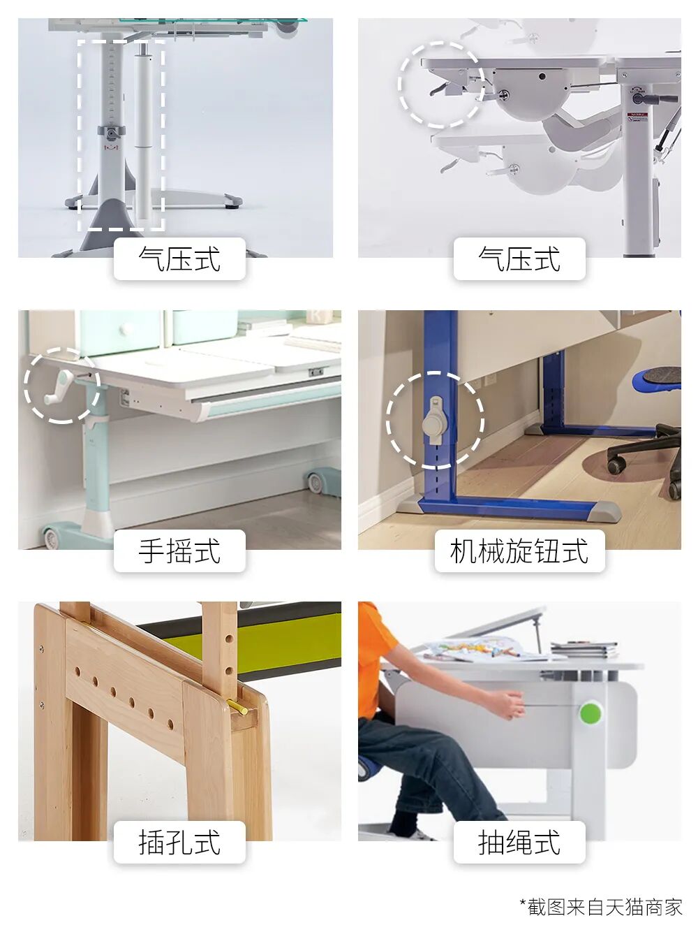 而让很多同学选购时比较纠结的,应该是桌子的调节方式了。学习桌桌面高度的调节方式包括手摇式、气压式、机械旋钮式、插孔式、抽绳式等,其中以手摇式和气压式居多。