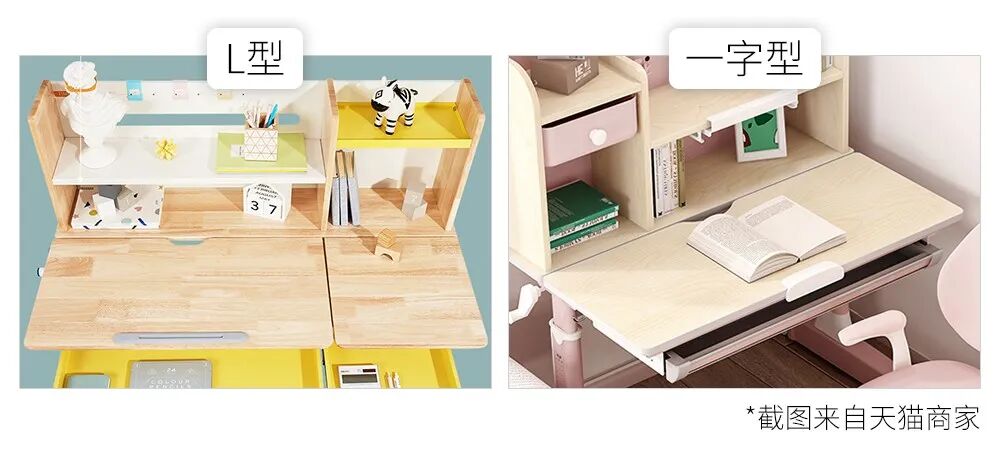 但如果家里空间不够在书桌旁摆放置物架或置物台的,则建议选择L型,因为在手边有区域可以放置水杯、堆叠的书本等还是很必要的。