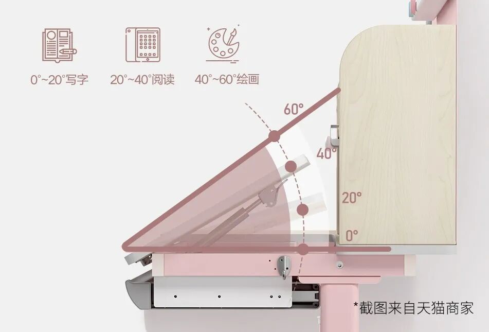 其实,0-40°基本可以满足日常写字、阅读、画画的需求了。而那些倾斜范围可达60°、80°的桌子,对不少孩子来说可能用得不是太多,但如果孩子会较多往美术发展的话,那就优选这些调节范围大一点的桌子,方便进行各种方式的绘画。