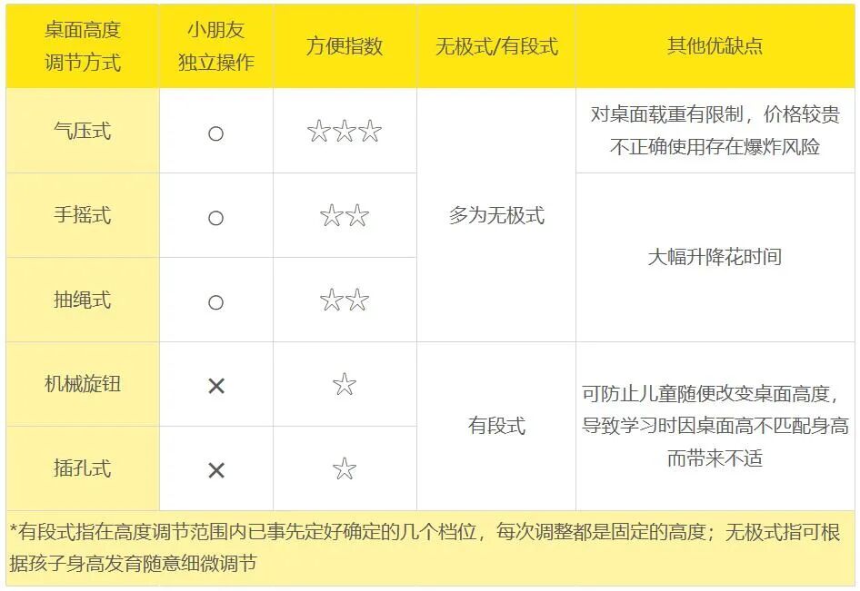 但如果你家孩子在使用时经常会有大幅度调节升降的需求,例如平时还会站着画画、看书,因此经常要坐立交替的话,那选气压式会更方便一点。而基于气压式在安全方面更需要注意一下,所以如果选气压式的,建议更多考虑品质可靠的大品牌产品。