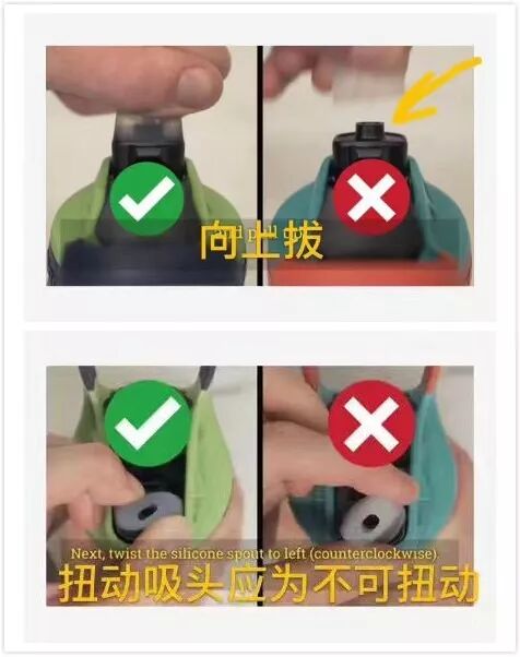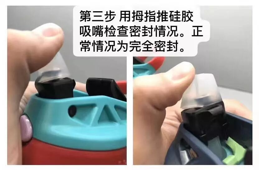 3. 用拇指推动硅胶吸嘴,分别尝试前后左右四个方向推动,并尝试往上拔吸嘴和旋转吸嘴,如果吸嘴没有松动,不能被拔起或旋转,可以继续放心使用;如果有上述情况出现,请立刻让孩子停止使用该水杯,并联系厂检,要求换一个全新安全的水杯盖子。