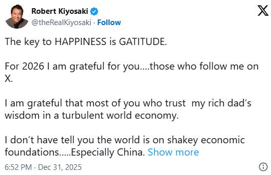 新的一年,理財暢銷書《富爸爸,窮爸爸》作者羅伯特清崎(Robert Kiyosaki)在社群發出警告,表示世界經濟根基岌岌可危,並點名「中國最嚴重」。