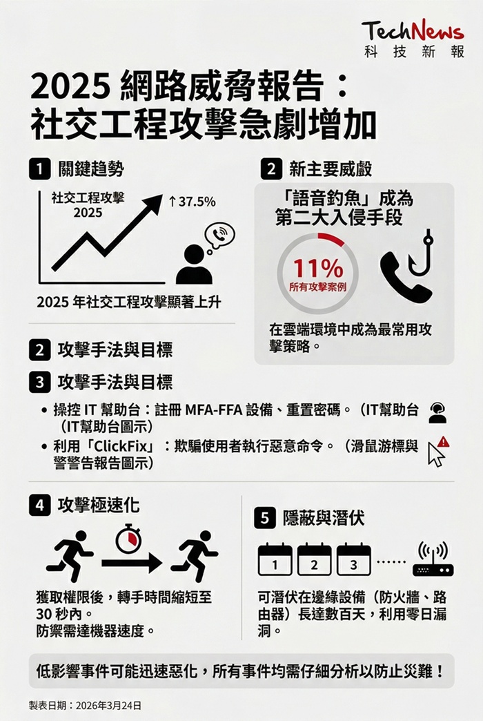 根據 Google Cloud 的 Mandiant 顧問部門最新報告,社交工程(Social Engineering)攻擊在 2025 年顯著上升,特別是語音釣魚(voice phishing)成為網路犯罪分子獲取初始訪問權限的第二大手段,並在雲端環境中成為最常用的攻擊策略。報告指出,語音釣魚在 2025 年占據了 11% 的攻擊案例,顯示出這種互動式的社交工程手法對於企業的安全構成新挑戰。