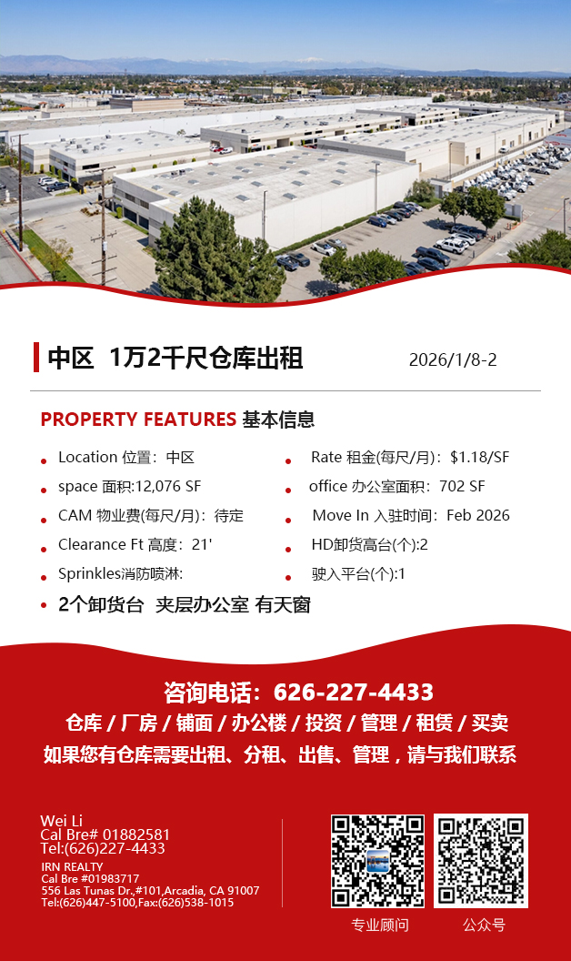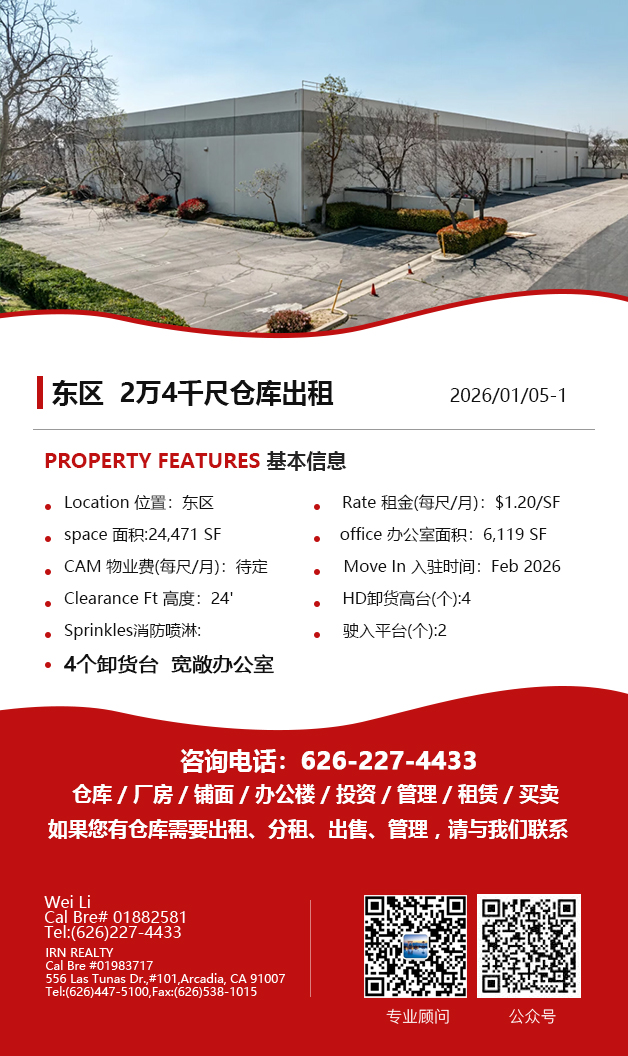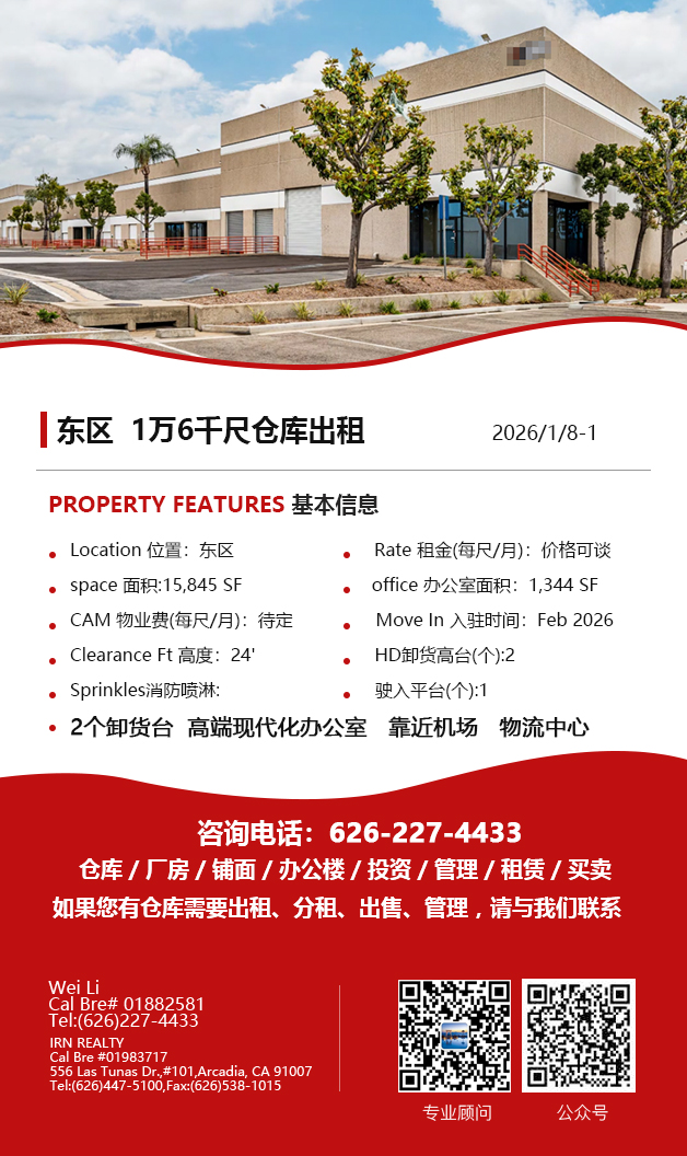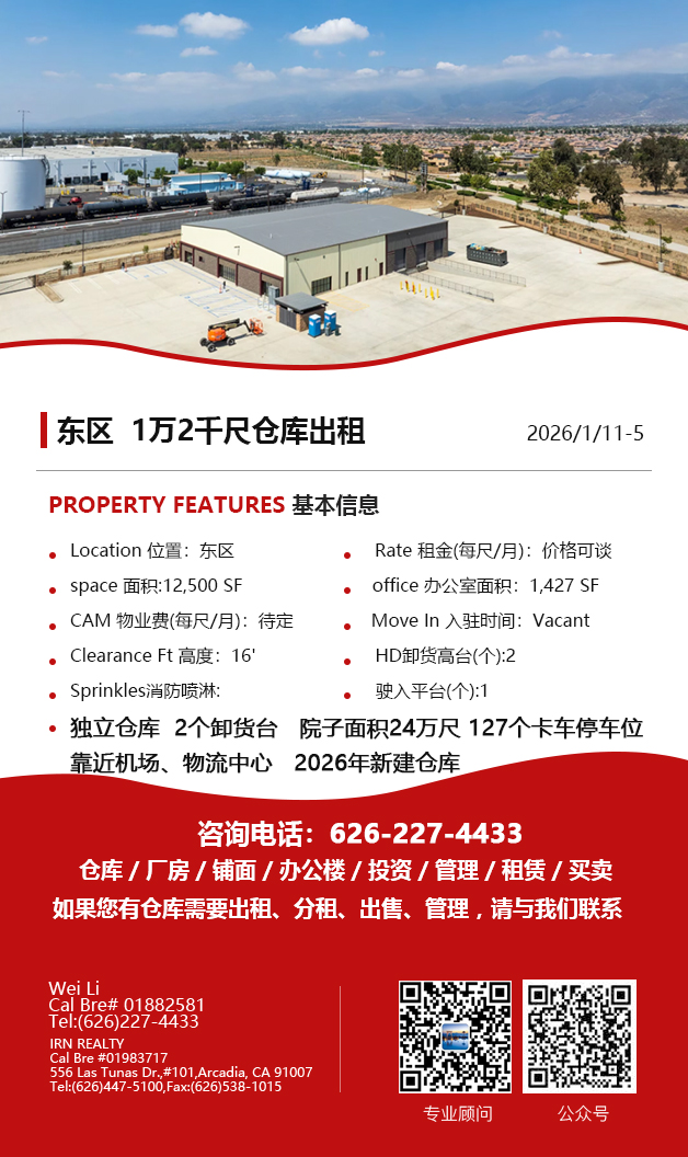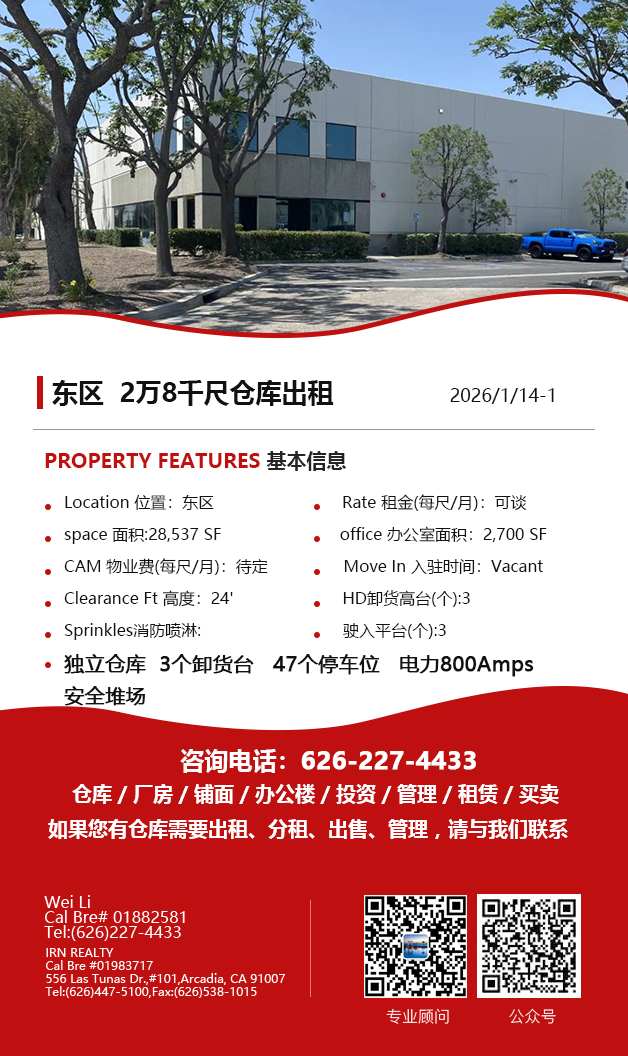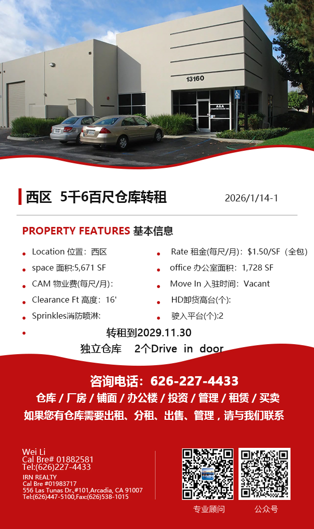 【仓库出租】Wei Li专业商业地产团队提供,1月15日,洛杉矶仓库出租更新,电话 626-227-4433,官网 www.51warehouse.com