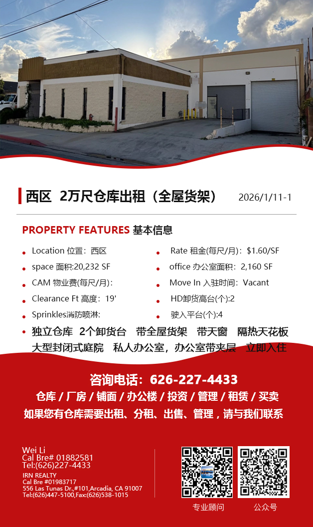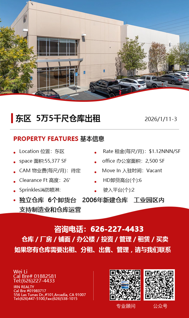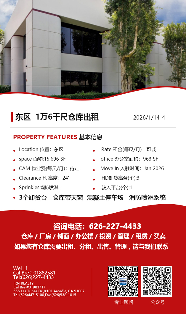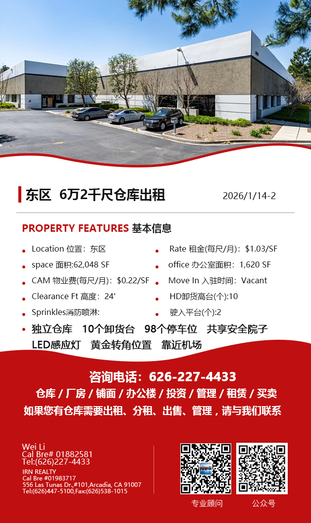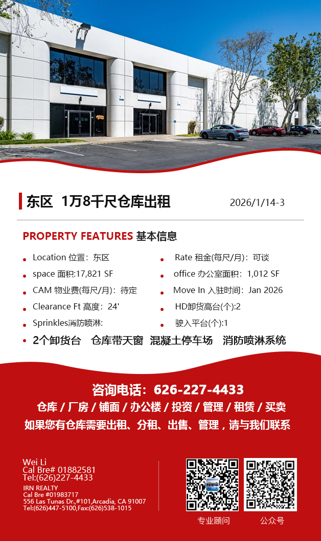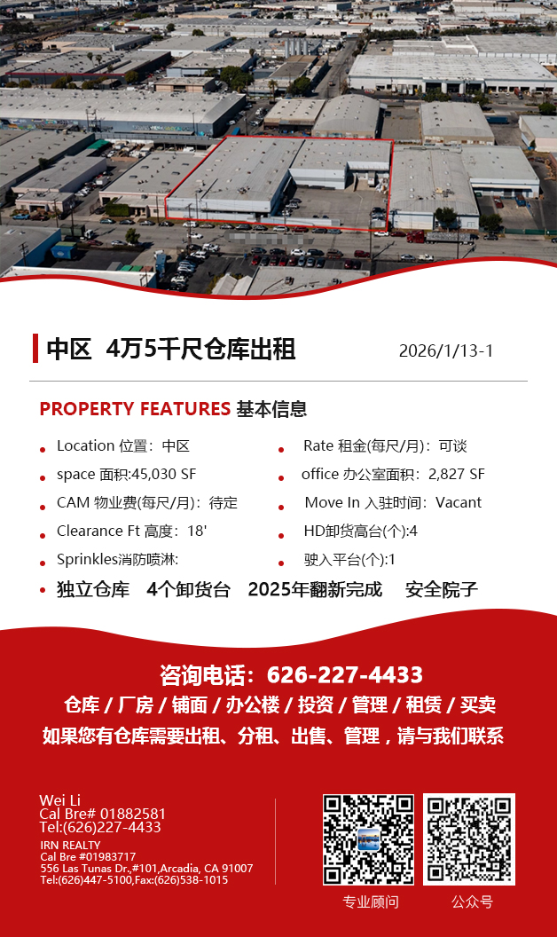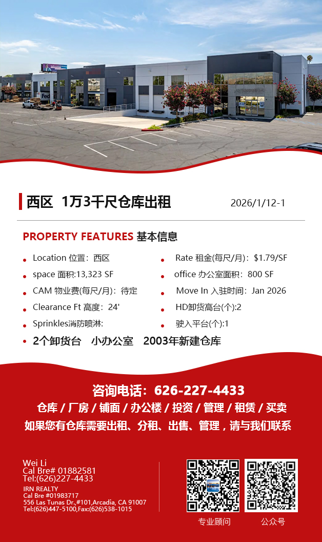 【仓库出租】Wei Li专业商业地产团队提供,1月15日,洛杉矶仓库出租更新,电话 626-227-4433,官网 www.51warehouse.com