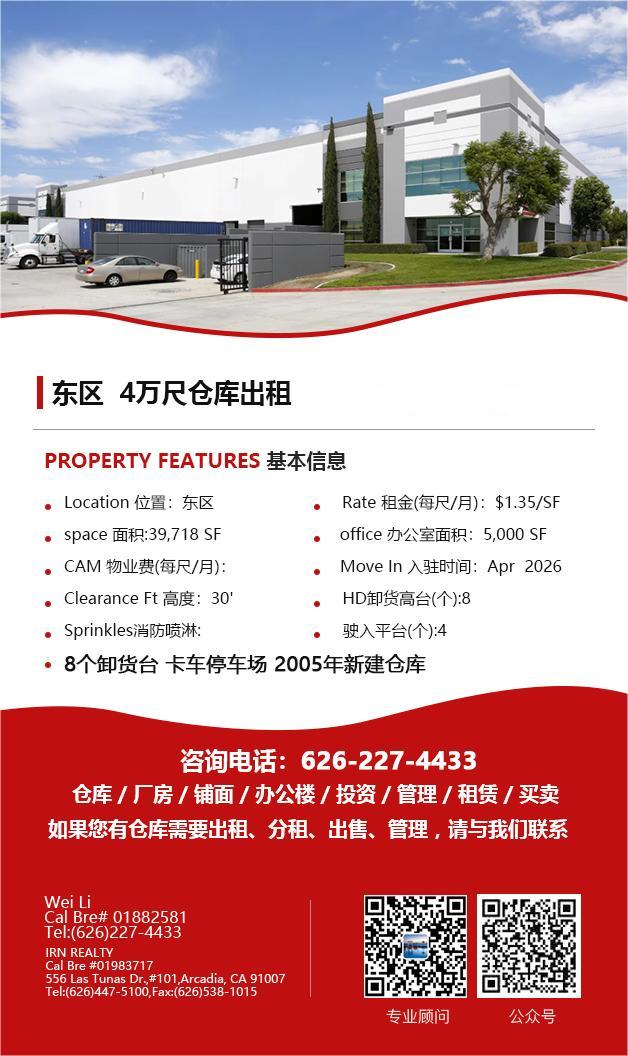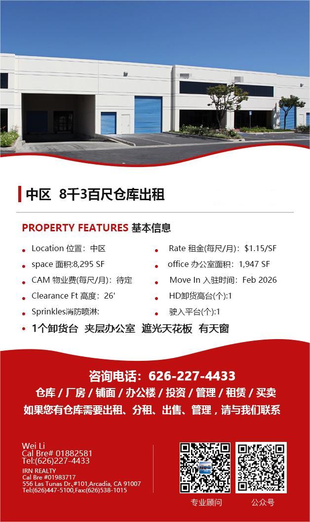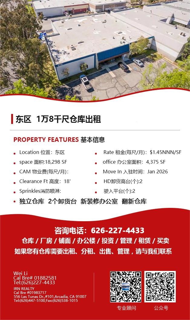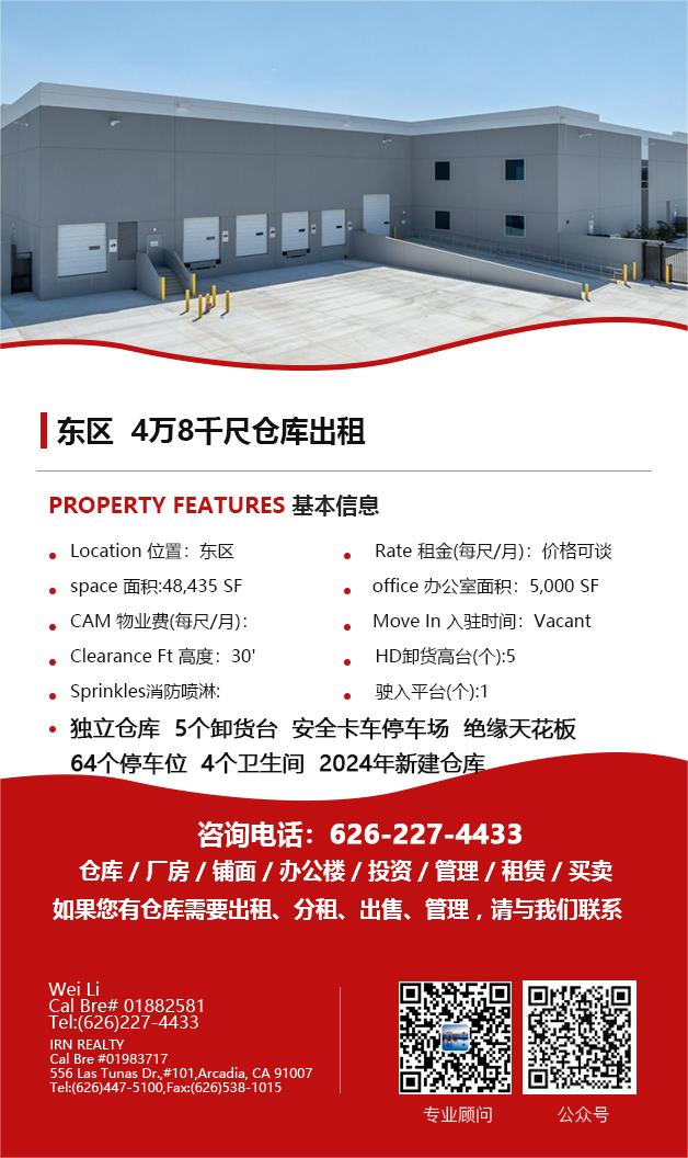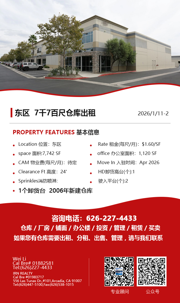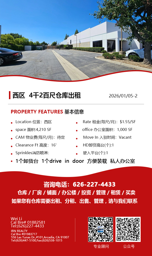 【仓库出租】Wei Li专业商业地产团队提供,1月15日,洛杉矶仓库出租更新,电话 626-227-4433,官网 www.51warehouse.com