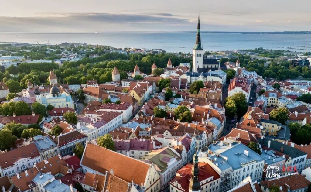 塔林留给我们的总体印象,色彩斑斓的古城上方,就是平静如镜的芬兰湾,无人机拍摄图片。
