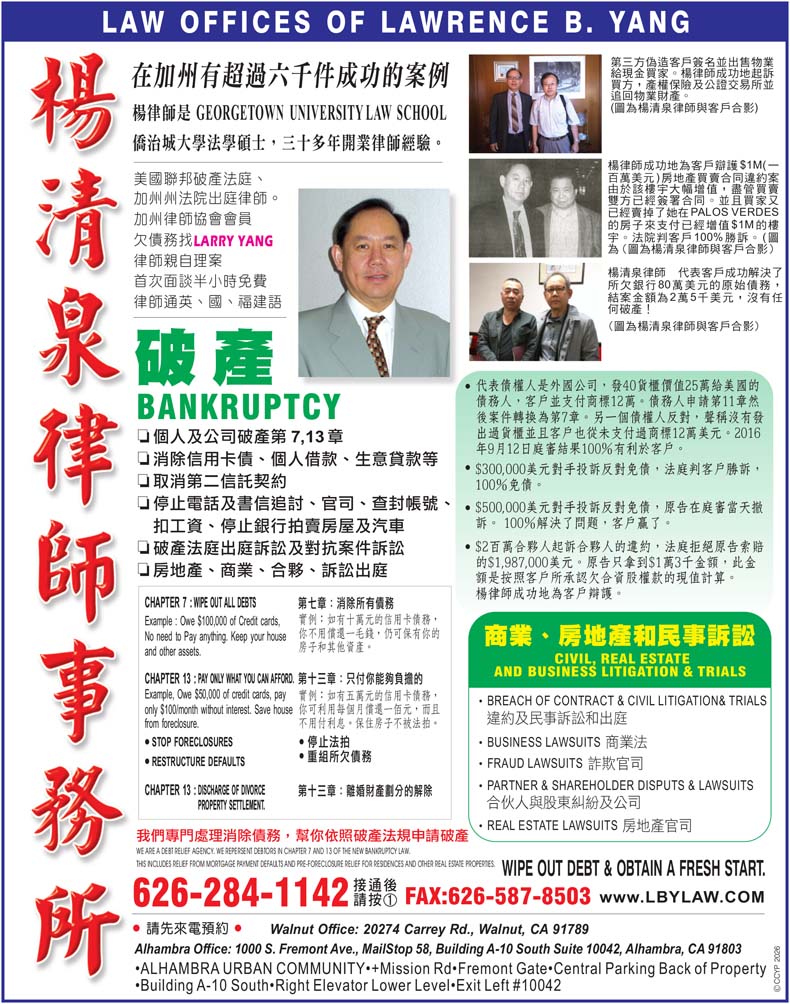 杨清泉律师事务所,成功案例分享:1.成功案例:第三方伪造客户签名并出售物业给现金买家。杨律师成功地起诉买方、产权保险及公证交易所并追回物业财产。2.成功案例:杨律师成功地为客户辩护$1M(一百万美元)...